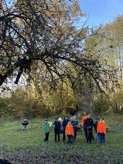 Anschließend übernahm Jonathan Henning aus Wendehausen, Streuobstwiesen-Fachwirt in Ausbildung, die praktische Anleitung. Er zeigte den Junior Rangern, wie die fachliche Pflege eines alten Baumbestandes vorgenommen wird. Die Kinder staunten über die Seilklettertechnik, die es ihm ermöglicht, gesichert in der Obstbaumkrone zu arbeiten.