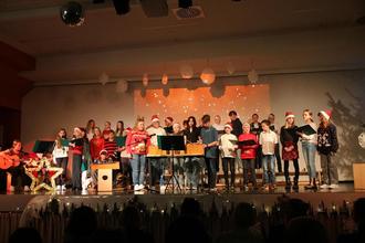 Der Chor und die Solisten begeisterten alle mit ihrem Programm. Unter der Leitung von Frau Hunold boten die Schüler der Klasse 6 und 5 und einige Solokünstler wie: Lina-Sophie Hildebrand, Antonia Simon, Ida Hackethal, Emma Home, Clara Koch, Klea Scheide und Felix Hüther fantastische Darbietungen. Einige Schüler begleiteten Stücke an der Gitarre und am Schlagzeug, andere sangen traumhafte Soli.
