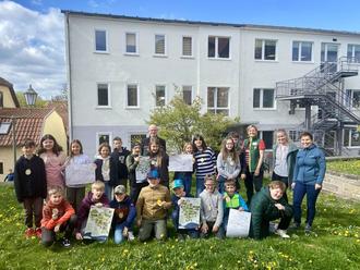 Die Viertklässler der Grundschule Berka halten die drei Kinderkarten und das Ausmalbild in ihren Händen. Vorab erlebten Sie eine bewegungs- und lehrreiche Unterrichtsstunde zum Thema Natur.