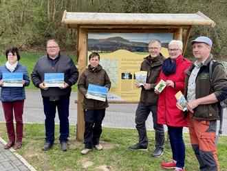 Gemeinsam die Region gestalten, dass geht bei solchen Projekten nur zusammen! Hier Viola Höppner (VG Ershausen/Geismar), Martin Kozber (BM Geismar), Claudia Wilhelm und Uwe Müller (Naturparkverwaltung), Ute Morgenthal (HVE) und Stefan Sander (Stiftung Naturschutz Thüringen) am neu eröffneten Rundwanderweg Kreuzstieg Hülfensberg.