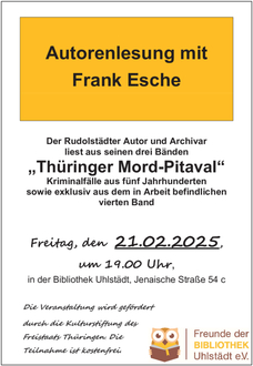 Am Freitag, den 21.02.2025, um 19.00 Uhr, laden wir zu unserer diesjährigen Auftaktveranstaltung in unsere Bibliothek. Im Mittelpunkt der Buchlesung des Rudolstädter Autors und Archivars Frank Esche stehen die in seinen drei Bänden „Thüringer Mord-Pitaval“ behandelten Kriminalfälle aus fünf Jahrhunderten. Außerdem wird aus dem in Arbeit befindlichen vierten Band "Thüringer Mord-Pitavall" exklusiv gelesen! Er spannt den chronologischen Bogen von 1606 bis zum Jahr 1968 und geht dabei auf manches, längst der Vergessenheit anheimgefallene Schwerstverbrechen in der thüringischen Geschichte ein. Einige der Fälle haben Rechtsgeschichte geschrieben!
