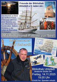 Der Marinemaler Olaf Rahardt aus Rudolstadt wird am Freitag, den 14.11.2025 um 19.00 Uhr, in unserer Bibliothek über seine dreiwöchige Segelreise auf der GORCH FOCK berichten. Freuen Sie sich auf die unterhaltsame Schilderung über die Erfüllung seines Kindheitstraums und was ein Marinemaler sonst so alles erlebt. Der Eintritt ist frei, Spenden sind erwünscht - und natürlich können Sie an dem Abend auch den Kalender für 2026 kaufen.