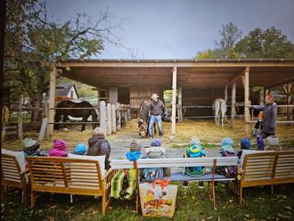 Bereits im Oktober erhielten unsere Werkstattkinder eine Einladung zu Raphaels Eltern Ilze und Ronny aus Großkochberg. Sie haben sich in ihrer Freizeit dem Pferdesport verschrieben und wollten uns Einblicke in das spannende Leben der Pferde geben, was es bedeutet, sie zu pflegen, zu bewegen, zu nutzen und vor allem, wie Mensch und Pferd partnerschaftlich füreinander da sind. So durften die Kinder selbst einmal Striegel und Bürste in die Hand nehmen und das Fell der Tiere damit putzen. Sie konnten sogar die Pferde aus ihrer Hand fressen lassen und sie später auf die Koppel begleiten. Mit Mut und Achtsamkeit begegneten wir den Pferden und verstanden dabei, dass Tiere auch Lebewesen sind, die mit uns ohne Worte aber mit der Sprache des Körpers „sprechen“.