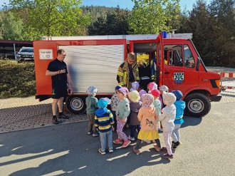 Als besonders Highlight folgte ein Besuch bei der örtlichen Feuerwehr Kirchhasel. Unter der fachkundigen Anleitung lernten die Kinder alles über Brandschutz, die Feuerwehrausrüstung und das richtige Verhalten im Notfall. Besonders begeistert waren die Kinder von dem Feuerwehrfahrzeug, dem Blaulicht und der lauten Sirene sowie von den vielen Gerätschaften. Im Feuerwehrhäuschen gab es viel zu entdecken, die Funkgeräte konnten live getestet werden - alle waren begeistert bei der Sache.