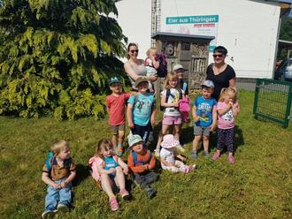 Am 01.06.2023 fuhren wir mit dem Bus nach Teichweiden und liefen von der Bushaltestelle aus bei schönstem Wetter zum Geflügelhof. Dort wurden wir mit einem leckeren Frühstück empfangen mit Brötchen, Wienerwürstchen, Obst und Gemüse und – natürlich – bunte Eier. Außerdem gab es für jedes Kind auch ein kleines Geschenk zum Kindertag.