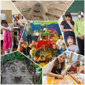 Unter dem Motto „Alles bewegt sich“ starteten alle Kinder der Klassen 1-4 vom 15.-17.5. in drei kreative Tage in denen sie sich ausprobieren konnten, Hände und Gedanken in Bewegungen kamen und sie ihre Umwelt mit allen Sinnen erleben durften. 17 unterschiedliche und vielfältige Angebote standen zur Auswahl. So konnte z.B. mit Füßen, Händen und Zahnbürsten das „Längste Bild der Welt“ kreiert werden, frei wie einst Jackson Pollock oder sie beschlugen Gasbetonsteine wie richtige Bildhauer. Für jeden Geschmack war etwas dabei: Theater zu selbsterdachten Stücken, stilvolle Vintage-Truhen mit handwerklichem Knowhow, Bauhaus-Sitzhocker, Schmuckdesign, Mode, Macramé, Maskenbau, indigene Kunst und sinnliche Sandkunst, Arbeiten mit Ton, Draht, Müll oder Pappmache`.
