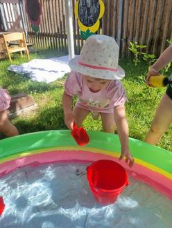 Aber dann – ging es richtig los. In unserem bunt geschmückten Garten standen schon die mit Wasser gefüllten Pools. Alle Kinder durften Wasserpistolen mitbringen. Was für ein Spaß! Wir lieferten uns mit unseren Erzieherinnen eine wilde Wasserschlacht. Ein Glück, dass es so schön warm war und die Sonne mit uns um die Wette gelacht hat. Handtücher waren auch nicht nötig. Ruck Zuck trockneten alle Kinder und Erzieher.