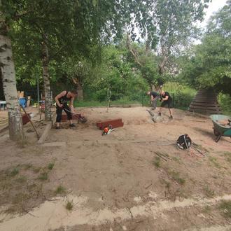 Der alte Sand wurde zu unserer großen Erleichterung bereits durch den Bürgermeister entsorgt, dafür ein großes Dankeschön! So hatten wir die kleine Aufgabe, 22 Tonnen Sand auf die Sandkästen im oberen und unteren Spielplatz zu verteilen. Mit wenig Leuten, aber mit doppeltem Krafteinsatz, haben wir alle Aufgaben an diesem Tag gemeistert. Die Sandkästen sind voll und wurden gleich am nächsten Tag durch alle Kinder eingeweiht. Die Anfänge für eine neue Matschstraße wurden gelegt. Dafür wurden die Reckstangen versetzt und der Kiesplatz neu aufgeteilt.