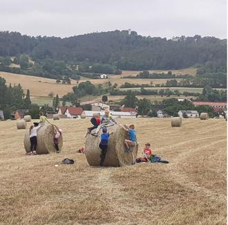 Die Kirchhaseler Kinder hatten die schwere Aufgabe in der großen Sommerhitze eines der größten Orte zu präsentieren. Vom versunkenen Bierkeller unterm Dorfgemeinschaftsplatz ging es zum sagenbehafteten Steinkreuz, was die Achtsamkeit der Kinder auf solche Kreuze und das Herausfinden der Bedeutungen anspornte. Herr Dudda erzählte uns im Anschluss über die Geschichte der Landwirtschaft, führte alte Maschinen vor und betonte die Bedeutsamkeit der Landwirtschaft für alle in der Gemeinde. Danach wanderten wir alle über die Plüsch nach Oberhasel wo Theo den für ihn größten Ort hochleben ließ. Egal ob die besonderen Orgelpfeifen der Kirche, das Hochwasser, Opas Bruder oder das Geisterhaus am Brunnen- alles hatte eine Geschichte. Theos Kür – ein musikalisches Stück auf seinem Schlagzeug läutete das letzte Highlight des Tages ein. In der Backscheune durften alle Kinder mit Herrn und Frau Hercher selbst Pizza belegen und im alten Backofen backen. Unvergesslich! So ging die Liebe zum Dorf mit allen Sinnen durch den Magen ins Herz.