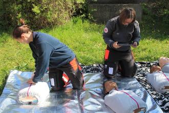 Schülersanitäterinnen Pia (links) und Lena (rechts) bei der Anleitung von Schülerinnen zur richtigen Herz-Lungen-Wiederbelebung