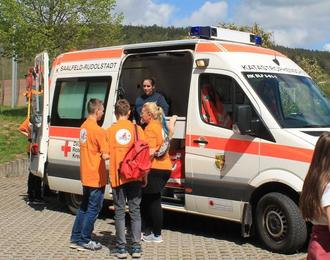 Schülersanitäter Paul und Phil bei der Besprechung mit Fr. Orlamünder und Jessica Tänzer am KTW Typ 2 der Bereitschaft Saalfeld