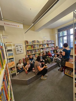Einen besonders schönen Tag erlebten die „Großen Sperlinge“, als sie sich am 28.05. 2024 mit dem Bus auf den Weg nach Rudolstadt in die Stadtbibliothek machten. Frau Wittekind hieß uns in ihrem Haus herzlich Willkommen. Es ist immer wieder eine Freude, mit wie viel Herzblut, Liebe und Freude sie derartige Besuche für Kinder gestaltet. Vielen lieben Dank dafür!! Eine Lesung mit vielen Einblicken in das Buch „Waldtage“ weckten die Neugier auf weitere Bücher und Bibliotheksbesuche genauso wie das „Durchstöbern“ der Bücherregale, Spiele und anderer Audio- und Videoangebote. Mit vielen schönen Eindrücken im Gepäck und einem leckeren Rudolstädter Eis im Bauch kehrten die kleinen Bücherwürmer zurück in ihr „Großes Sperlingsnest“ im Kindergarten.
