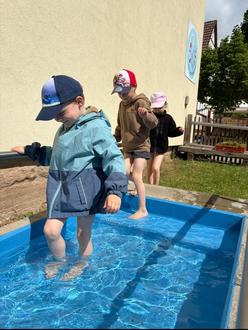 Anschließend ging es barfuß über unseren Fußpfad und danach ins kühle Nass: Gemeinsam wateten die Kinder wie ein Storch durch das Wasserbecken - ein spaßiges und gleichzeitig gesundes Erlebnis. Das sogenannte Wassertreten ist eine der zentralen Anwendungen der Kneippschen Lehre, die auf fünf Säulen beruht - eine davon ist das Wasser. Auch Armbäder, Kniegüsse oder Barfußlaufen gehören zum täglichen Alltag in unserer Kneipp-Einrichtung.