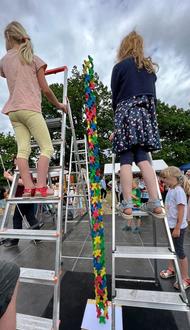 Weiter ging es am 16. Juni zum Kreisfinale des Wettbewerbes im „X-Mannis-Stapeln“ nach Rudolstadt. Erst in diesem Jahr neu ins Leben gerufen wurde ein Stapelwettbewerb durch die Firma „Ankerstein GmbH“ Rudolstadt, an dem die Vorschulkinder aller Kindergärten des Landkreises teilnehemen können. Unter den beinahe 50 teilnehmenden Einrichtungen wurden in einer Vorrunde 7 Finalisten ermittelt, die dann unter sich den Kreismeister im „Hochstapeln“ ausmachten. Gemeinsam mit ihren Eltern traten Alessia, Anastasia, Charlotte, Leon und Miri dort an und erstapelten sich den 3. Platz auf dem Podest und durften mit stolzer Brust und dem Bronze-Pokal die Heimreise antreten. Alle Werkstattkinder und Erzieher waren super-glücklich über dieses herausragende Ergebnis.