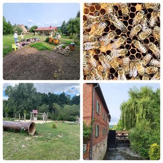 Sicher ausgestattet saßen wir vor den Bienenvölkern und erfuhren wie Bienenstöcke aufgebaut sind, dass man Rauch braucht um sie zu beruhigen und man sich vorsichtig bewegen muss. Herr Schroth zeigte uns sogar eine Bienenkönigin. Sie sieht ganz anders aus als die anderen Bienen und sie ist auch viel größer. Wir durften auch den Schlupf eines Bienchens erleben. Es ist ganz schön wuselig in so einem Bienenstock. Fast so wie in unserem Kindergarten. Die Bienen summen sehr laut und können mit ihren Flügeln Wind zum Kühlen produzieren. Dann ging es zum Honig schleudern. Das geht so. Erst wird das Wachs von den Waben gekratzt, dies nennt man Entdeckeln. Das Wachs kann man essen, die Imker nennen es Imkerkaugummi. Der schmeckt uns nicht so gut. Dann werden die Waben in die Schleuder gehängt und es muss kräftig am Rad gedreht werden. Und schon läuft goldener Honig heraus. Versüßt wurde unser Tag noch mit leckerem Honigbrot welches Frau Schroth für uns zubereitete.