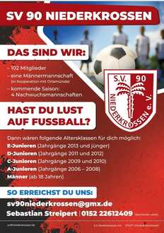 Beim SV90 Niederkrossen könnt ihr in den verschiedenen Mannschaften in eurer entsprechenden Altersgruppe (zwischen 6 und 40 Jahren) Fußball spielen.