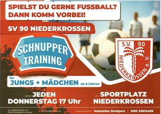 Am Donnerstag, den 14.09. findet 17 Uhr ein Schnuppertraining für alle Fußballinteressierte auf dem Sportplatz in Niederkrossen statt.