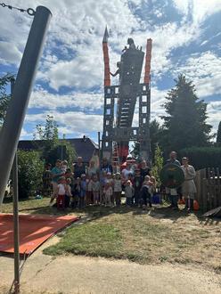 Für diesen Tag waren wir eigentlich alle geschafft, aber unser Träger hat allen Kindergärten der JUH e.V. eine schwere Aufgabe gestellt: WER BAUT DEN HÖCHSTEN TURM? Und diese Aufgabe wollten wir gemeinsam mit vielen fleißigen Helfern auch noch an diesem Nachmittag erfüllen. Tagelange Vorbereitungen, Malen, Basteln, Schrauben, Hämmern, Planen, Denken. Und weil alles gut durchdacht war, haben wir uns im Vorfeld Helfer bestellt! Einerseits waren ganz viele Eltern, Großeltern, Kinder und unser Bürgermeister zur moralischen Unterstützung da, andererseits ging die Zeutscher Feuerwehr mit großer Technik ans Werk. Herr Warnke hat ein ganz altes Teil mitgebracht, eine W 50 Drehleiter, die die Feuerwehrmänner früher verwendet haben. Großen Dank an R. Warnke, M. Wehnert, St. Geinitz und S. Holoda für Ihre Hilfe! So entstand aus Bananenkartons, OBI Eimern, Tapetenrestern, Pappen und Holzleisten gemeinsam mit den Kinder ein riesiges Bauwerk an unserem Gartentor! Der vorbereitete und zusammen geschraubte Torbogen wurde dann durch einen Flaschenzug in die Höhe gezogen und Dank der bereitgestellten Drehleiter entstanden die Zinnen aus gesponserten OBI Eimern. Die Krönung war das Aufsetzen der Zeutscher „Wiedbachspatzen“ Flagge. Damit wusste jeder, wer hier der Herr im Hause ist. Das haben wir uns in der Kemenate vorher genau angeschaut, so viele Flaggen und Wappen gab es dort! Ein echter Ritter mit seinem Knappen hat sich von der ordnungsgemäßen Errichtung des Bauwerkes persönlich überzeugt. Vielen Dank Ritter Marco und Knappe Theodor!