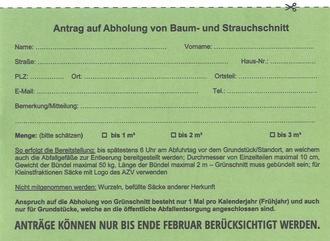 Den Antrag finden Sie in der neuen AZZE LIGHT (Mittelteil, Grüne Karte) oder Sie nutzen auf der Homepage des AZV unter www.azv-wak-ea.de die Funktion der Online-Anmeldung. Die Funktion „Grünschnittabfuhr auf Abruf“ finden Sie in der Rubrik der Abfallentsorgung.