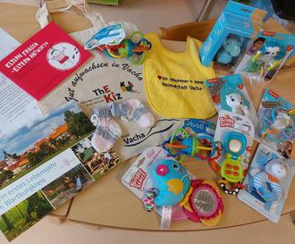 Mit der Begrüßungstasche werden die Familien einen Gruß vom Bürgermeister Martin Müller, ein kleines Geschenk, gesponsert durch die ortsansässigen Spielwarenläden „Wilhelm Rug-Kinderland“ und „Spielwaren Rug“ (beide am Markt Vacha zu finden), Babykalender und Elternbroschüre sowie einen Kindergartenantrag erhalten.