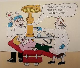 Die Ausstellung mit 90 Karikaturen von Horst Saar befasst sich zum einen mit dem Thema „Der Zahnarzt - dein Freund und Helfer“. Wohl jeder kennt den Zahnarzt. Viele Menschen haben sogar eine panische Angst vor ihm. In seinen Bildern stellt der Künstler auf amüsante Art und Weise das Verhältnis von Zahnarzt und Patient dar.