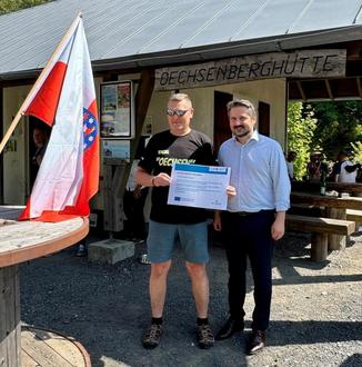 Symbolische Übergabe des Förderzertifikates an Hüttenwart Steffen Holtzhauer (links) durch Landrat Dr. Michael Brodführer