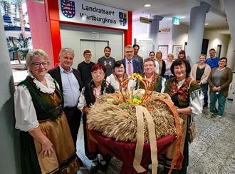 Erntekronen wurden in früheren Jahrhunderten nach Beendigung des Kornschnitts von den Schnittern an den Gutsherren überreicht, heute sind sie in vielen Gemeinden traditioneller Bestandteil des Erntedankgottesdienstes. War es anfänglich nur eine größere Korngarbe, wurde später ein Erntekranz oder auch eine Krone daraus. Eine kirchliche Segnung und ein Erntelied gehörten zur Übergabezeremonie, die in Tanz und Essen ihre Fortsetzung hatte. Der Landrat dankte an dieser Stelle auch noch einmal den Landfrauen, der Kirchgemeinde und dem Bauernverband für das sehr gelungene Kreiserntedankfest in der Eisenacher Georgenkirche am Sonntag zuvor.