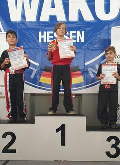 In der Kategorie "Pointfighting U13 -155cm Newcomer" sicherte sich Henning Kettner aus Urnshausen/Dermbach, den fünften Platz. In einem intensiven Kampf gegen Vince Dave Coble von Kick-Boxen Lollar erzielte er 10-16 Punkte. Henning zeigte dabei ein selbstbewusstes und zielgerichtetes Auftreten. Sein Teamkollege Iven Baumann (Wiesenthal) trat ebenfalls in dieser Größenklasse an. In 4 Duellen erreichte der Sportler der Kampfsportschule Berk Bad Salzungen den 2. Platz (1. Kampf 13-9 gewonnen gegen Noah Stefan Kraft, Kickboxschule Büdingen / 2. Kampf 10-0 gewonnen gegen Levi Bomke / 3. Kampf 16-6 gewonnen gegen Peer Stund, SV Grün Weiß Harburg). Im Finale gegen Pierre Döring (Kickboxschule Büdingen) fehlte Iven die gewohnte Spritzigkeit, sodass er mit 10 Punkten Rückstand (3-13) vom Büdinger Sportler besiegt wurde. Trotz der letzten Niederlage hatte er sich die Silbermedaille verdient erkämpft. Anschließend trat er noch in der Folgegruppe "Pointfighting U13 +155cm Newcomer" an und erlangte den 1. Platz mit 18-13 gegen Nilola Ljubicic (KBV Asslar e.V.) und 13-12 gegen Gustav Neiser (Kick-Box Team Eberswalde e.V.). Eine starke Leistung in der Klasse der Größeren.