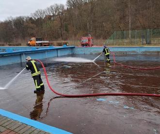 Nachdem die Becken leergelassen worden sind, hat der Bauhof der Stadt Vacha mit tatkräftiger Unterstützung der Feuerwehr Vacha die Becken mit Strahlrohren ausgespritzt. Im Anschluss werden die Becken mit Hochdruckreinigern vom Algenbewuchs befreit. Danach werden Schadenstellen repariert und die Becken wieder gestrichen. Wenn die Arbeiten abgeschlossen sind, können die Becken wieder mit frischem Quellwasser befüllt werden. Ziel ist es, dass Schwimmbad im Mai wieder zu öffnen.