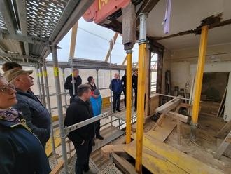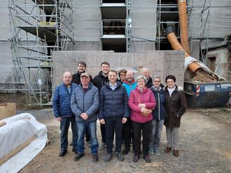 Mit Beginn des Frühjahrs hat Bürgermeister Martin Müller wieder die ersten Führungen auf der Baustelle des Rathauses Vacha durchgeführt. Die interessierten Bürgerinnen und Bürger erhielten einen Überblick über die bereits abgeschlossenen Bauabschnitte und konnten zugleich einen Blick auf die aktuell laufenden Zimmermannsarbeiten im 1. und 2. Obergeschoss des Hauptgebäudes werfen.