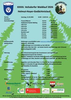 Am 21.03.2026 findet der 33. Veilsdorfer Waldlauf - Helmut-Hoyer-Gedächtnislauf statt. Ein Laufevent, dass jedes Jahr den Start für die Werra-Rennsteig-Cup-serie übernimmt. Auch in diesem Jahr sind das Organisationsteam um Vanessa Brehm-Matthes, Danny Schmidt und Christine Bernhardt bemüht, dass die Veranstaltung für alle Teilnehmer ein voller Erfolg wird. Die Strecken verlaufen wie üblich um den Weihbachgrund und durch den Wald - getreu dem Veranstaltungsnamen. Alle Laufinteressierten sind herzlichst eingeladen über die verschiedenen Strecken zwischen 300m und 9 km an den Start zu gehen. Die Streckenpläne können bereits über die offizielle WRC-Seite eingesehen werden. Zu beachten sind die geänderten Streckenzuweisungen und die Startreihenfolge. Die 2 km-Strecke (u14 - u16) startet direkt nach dem Hauptstart. Des Weiteren wird die Streckenführung vom Sportplatz wegwärts auf die Strecken für alle (außer Bambini) gleich sein, um Irritationen, wie im letzten Jahr zu vermeiden. Dabei sein, lohnt sich - alle Kinder werden bis zur Altersklasse 11 mit einer Urkunde zur Siegerehrung ausgezeichnet. Auch in diesem Jahr wieder der organisatorischer Hinweis, dass es nur teilweise möglich ist auf dem Parkplatz an der Sporthalle zu parken, weshalb darum gebeten wird, den Hinweisen der Feuerwehr vor Ort zu folgen.