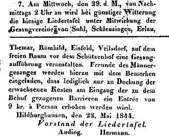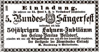 Der Gesangverein Veilsdorf blickt auf eine lange und bewegte Vereinsgeschichte zurück. Er zählt zu den ältesten Chören der Region und ist der älteste Verein in Veilsdorf. Als Gründungsjahr gilt 1844, weil in diesem Jahr nachweislich die Fahnenweihe erfolgte, wie in der Festrede zum 50. Fahnenjubiläum im Jahr 1894 beschrieben wurde. Der Chor war damals so bedeutend, dass hier das Bundessängerfest ausgerichtet worden ist.