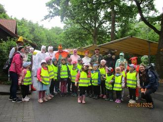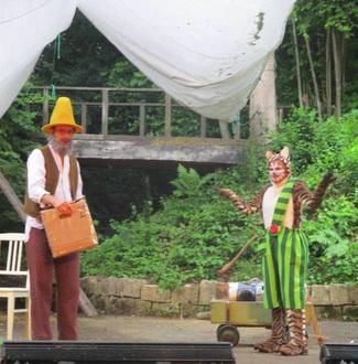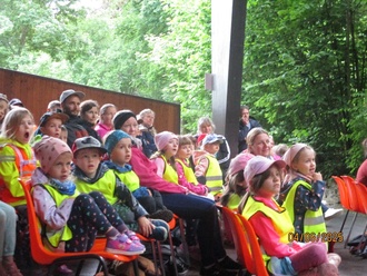 Mit dem Bus fuhren wir zusammen mit dem Kindergarten Heßberg und Veilsdorf nach Heldritt in die Waldbühne. Leider regnet es, aber unter der Überdachung sind wir gut geschützt. Nachdem wir uns kurz gestärkt haben, geht es auch schon los. Petterson und Findus erleben so einiges an diesem Nachmittag.
