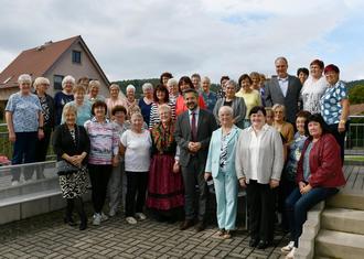 Landrat Dr. Michael Brodführer und Kieselbachs Ortsteilbürgermeister Bernd August gemeinsam mit den Landfrauen des Wartburgkreises