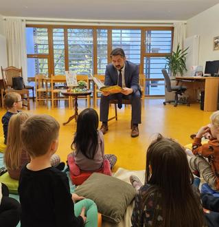 Aufmerksam lauschen die Kinder der Geschichte vom „Das Mam ohne Mut“, die ihnen Landrat Dr. Michael Brodführer vorliest.