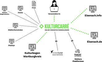 Zeitgleich arbeitete der Wartburgkreis auf der entstehenden Kulturbogen-Website ebenfalls am geplanten neuen Veranstaltungskalender im Rahmen des kreislichen Kulturentwicklungskonzepts. Nachdem die Kulturmanagerin des Wartburgkreises, Gloria Dittmar, bereits mit anderen Gemeinden Gespräche über die Umsetzung eines Veranstaltungskalenders geführt hatte, berichtete Ingo Wachtmeister, Kulturdezernent der Stadt Eisenach, im Gespräch von der geplanten Nutzung des Systems „Kulturcarré“ in der Stadt Eisenach und stieß den Gedanken an, dieses als gemeinsame, kreisweite Plattform einzurichten. Beide Seiten waren sich rasch einig, dass es sinnvoll wäre, wenn alle Bürgerinnen und Bürger