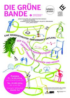 “Die Grüne Bande” ist ein Kooperationsprojekt des Landestheaters Eisenach zusammen mit dem kollektiv:proton und der Hochschule für Schauspielkunst Ernst Busch in Berlin. Zusammen wird eine mobile Wandertheater-Inszenierung für Kinder ab fünf Jahren und Familien entstehen, die an Orten am Grünen Band aufgeführt wird. Geschichten von Bewohner*innen, die an der ehemaligen Grenze leben, wurden in einer Recherchetour entlang des grünen Bandes gesammelt und bilden die inhaltliche Grundlage für die Inszenierung. Diese und weitere Geschichten werden transformiert, sodass ein theatrales Spektakel für alle Generationen entsteht und Begegnungen und Gespräche stattfinden können.