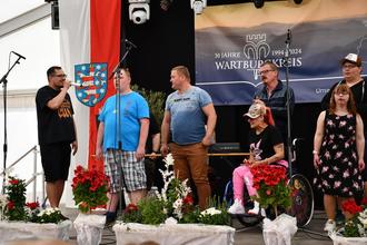 So war auf der großen Bühne im Festzelt bis zum späten Nachmittag ein vielseitiges Programm aus Chor, Tanz und Folklore zu erleben, bei dem rund 160 Mitwirkende vom Shanty-Chor aus Geraberg, dem Gospelchor der Musikschule Wartburgkreis, viel bejubelten Tanzformationen wie den „Flying Steps“ aus Gumpelstadt, den „Sunshines“ aus dem Landkreis Gotha oder den Tanzklassen der Musikschule Wartburgkreis bis zum Fanfarenzug aus Eisenach, Linedancern aus Schmalkalden-Meiningen und der Jugendbläsergruppe des Sulzberger Gymnasiums Bad Salzungen für Unterhaltung sorgten. Ein besonderer Höhepunkt war die Präsentation des Inklusionssongs der Hip-Hop-Gruppe „Die Unglaublichen“, den Menschen mit Behinderung aus der Wartburgregion gekonnt performten. Bergbahnkönigin Sylvia Darko aus dem Landkreis Saalfeld-Rudolstadt führte charmant durch den Tag und wurde selbst als mitreißende Schlagersängerin aktiv.