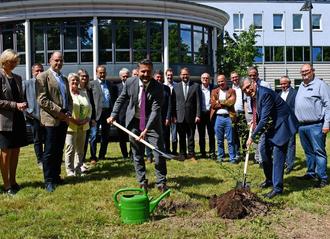 BAD SALZUNGEN. Eine Rotbuche haben Landrat Reinhard Krebs und sein Nachfolger Dr. Michael Brodführer vor dem Landratsamt Wartburgkreis im Beisein zahlreicher Bürgermeisterinnen und Bürgermeister gepflanzt.