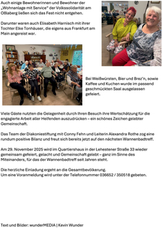 Am 29. November 2025 wird im Quartiershaus in der Lehestener Straße 33 wieder gemeinsam gefeiert, gelacht und Gemeinschaft gelebt - ganz im Sinne des Miteinanders, für das der Wannenbadtreff seit Jahren steht.