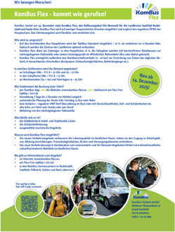 Während die Hauptlinien künftig im 2-Stunden-Takt verkehren und so die wichtigsten Orte zuverlässig miteinander verbinden, ergänzt KomBus Flex dieses Angebot. Mit modernen, barrierefreien Kleinbussen werden Fahrgäste von der nächstgelegenen Haltestelle abgeholt und zu einem Umstiegspunkt im Bus- oder Bahnnetz gebracht. Auch kurze Fahrten in Nachbarorte - zum Arzt, zum Einkaufen oder für einen Behördengang - sind möglich.