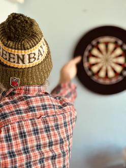 Sandy Plohmann beim Dart spielen im Vereinsheim des SC Wurzbacher Panther