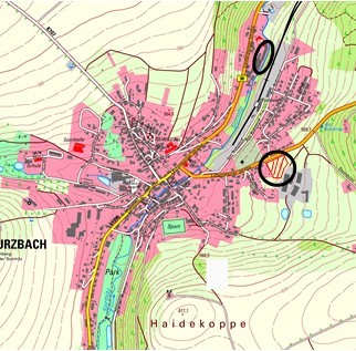 Der Geltungsbereich des vorhabenbezogenen Bebauungsplans umfasst einen Teilbereich des Flurstücks 516/13, Flur 0 der Gemarkung Wurzbach (kreisförmige Markierung). Die Ausgleichsfläche befindet sich im Bereich der Sormitz am ehemaligen Möbelwerk in Wurzbach (ovale Markierung).
