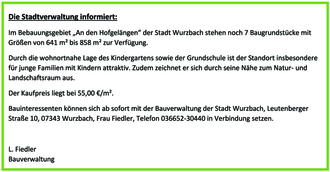 Bauinteressenten können sich ab sofort mit der Bauverwaltung der Stadt Wurzbach, Leutenberger Straße 10, 07343 Wurzbach, Frau Fiedler, Telefon 036652-30440 in Verbindung setzen.