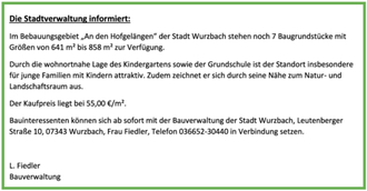 Bauinteressenten können sich ab sofort mit der Bauverwaltung der Stadt Wurzbach, Leutenberger Straße 10, 07343 Wurzbach, Frau Fiedler, Telefon 036652-30440 in Verbindung setzen.