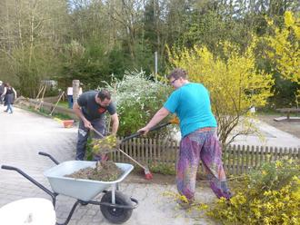 Einen gelungenen Arbeitseinsatz gab es am Freitag, dem 12. April im Außenbereich unseres Kindergartens am Wurzbächle. Elternvertreter, Eltern und Erzieherinnen krämpelten an diesem Nachmittag die Ärmel hoch und haben mit viel Elan, Einsatzbereitschaft jede Menge geschafft. So wurden alle vier Hochbeete erneuert, ein Duftbeet wieder chic gemacht, Sand in allen Sandkästen aufgelockert, Wege und Spielbereiche gefegt und von Unkraut befreit, Büsche geschnitten, das von den Kindern geliebte Holzspielhäuschen wurde abgeschliffen und neu gestrichen, Mutterboden angefahren, Gras angesät und jede Menge Grünabfälle zusammengetragen und sofort entsorgt.