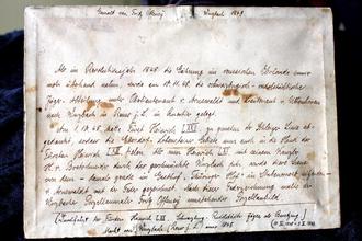 Die Rückseite ist ausführlich beschriftet und beschreibt das Ereignis, die Erstellung einer Zeichnung als Dokumentation und nennt einen Fritz Offeney, der das Porzellanbild 1849 nach erwähnter Zeichenvorlage malte.