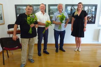 Vernissage in der GutsMuths-Gedächtnishalle Schnepfenthal am 15. 6. 2025: v.l. Sergej Schvedenko; Jürgen Funke, der französischen Chansons sang und auf seiner Gitarre spielte; Marc Sagnol und Atonia Frank, stellvertretende Ortsteilbürgermeisterin von Schnepfenthal