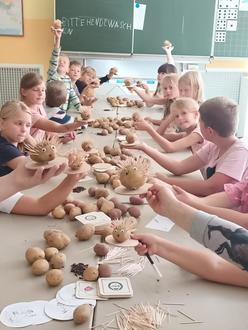 Mit Kartoffeln gebastelt und gedruckt hat man schon vor Jahrzehnten. Hier konnten sie auch dieses Jahr ihrer Kreativität freien Lauf lassen. Mit Messern und Ausstechformen entstanden tolle Figuren, welche dann zum Drucken benutzt wurden. Und mit Zahnstochern verwandelte sich so manche Kartoffel zum Igel.