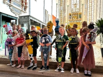 Schön waren sie wieder und niedlich anzusehen mit ihren großen Ranzen. Nach einer kurzen Begrüßung gestalteten die Kinder der 4. Klasse ein kulturelles Willkommensprogramm, welches sie extra für die „Neulinge“ vorbereitet hatten, um diese auf das Herzlichste in unserer Traumzauberbaum-Schule zu begrüßen. Dem Lehr- und Erzieherpersonal ist die Aufregung und der Wunsch der Kleinen, die ja vor allem wegen der Zuckertüten gekommen waren, nicht entgangen. Deshalb ließen Sie sich nicht lange Zeit, um die prächtigen Zuckertüten zu überreichen. Diese waren wieder vor dem prunkvollen Altar auf einem bunten Tuch zu einem Kreis gelegt. Nach und nach wurden nun die Schülerinnen und Schüler namentlich aufgerufen und durften jetzt ihre bereits sehnsüchtig erwarteten Schultüten endlich in den Armen halten. Nach einem kurzen Fotoshooting wurden anschließend dann alle Erstklässler von ihren Klassenlehrerinnen und Erzieherinnen aus der Kirche hinausbegleitet.